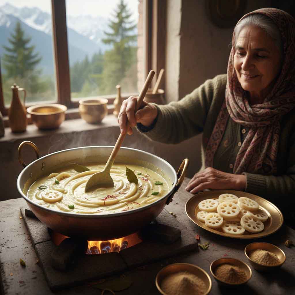 Nadur Yakhni means lotus stem curry. Lotus stem is a common ingredient in Kashmiri cuisine. The lotus stems are cut into long pieces and simmered in a yogurt gravy flavored with fennel seeds, dry ginger, bay leaves, cloves, and cardamom. Nadur Yakhni is celebrated for its mild, tangy, and aromatic flavour. It is considered a Sattvic dish because it is traditionally prepared without onion and garlic.
